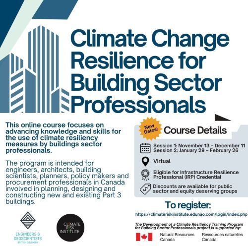 The Climate Risk Institute, in collaboration with Engineers and Geoscientists BC, developed a course funded by Natural Resources Canada. It provides a foundation for climate risk assessment and resiliency measures in planning, design, and construction of Part 3 buildings. The course supports capacity building for engineers, architects, planners, and other building sector professionals.