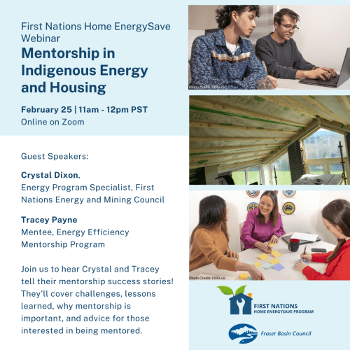 Do you want to learn more about how mentorship can advance energy efficiency in BC's First Nations communities? Join the Fraser Basin Council on Wednesday, February 25 from 11:00am to 12:00pm PST for a free webinar on mentorship in Indigenous energy and housing!